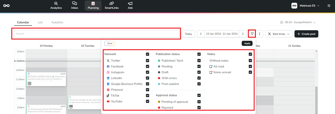From the Calendar or the List you can filter your content by Social Network, Post Status and Notes. In addition, you have a text search engine to find a specific post.
