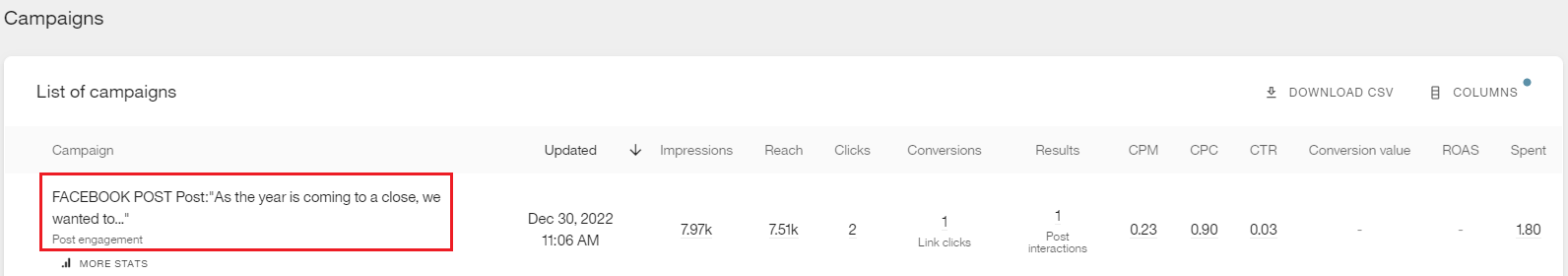 You can also check the results within the Meta Ads campaigns list. To differentiate a boosted post from an ad campaign, you will see that "post" is indicated and also part of the text of the promoted post is displayed.