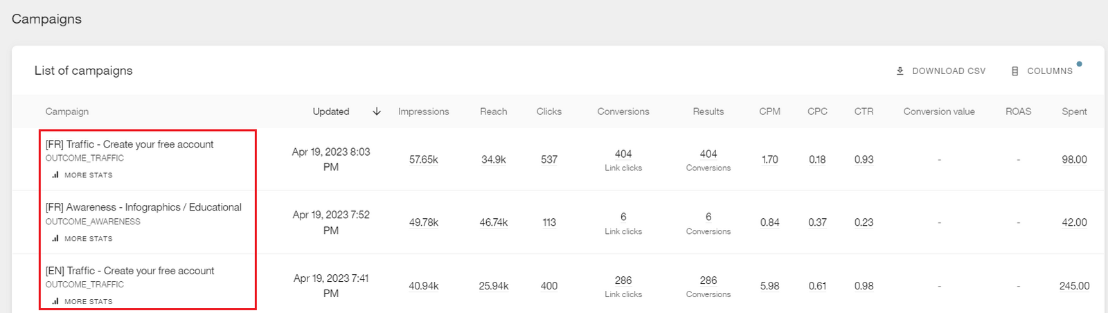 In Metricool you can see the results at campaign level in the Meta Ads analytics, with the name assigned in the campaign creation. It is possible to create reports with ad-level data with the Looker Studio connector (included in the Advanced and Enterprise plans).