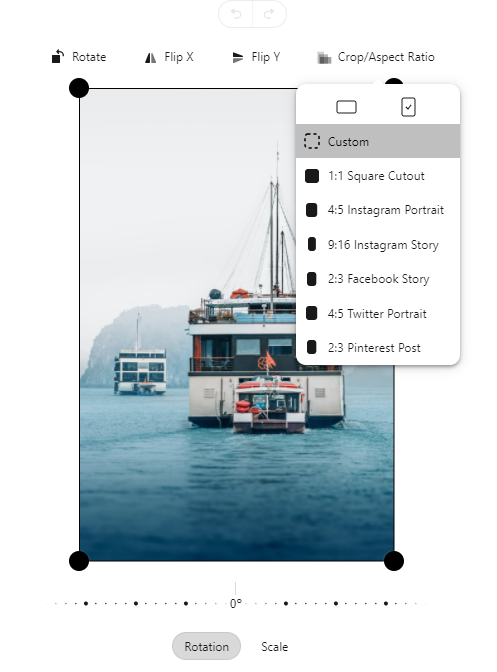 Size: In the first option you can crop your image to the size you need. Also rotate, zoom or flip the image. Crop/Aspect Ratio to fit the image to a specific size, for example Instagram Story.