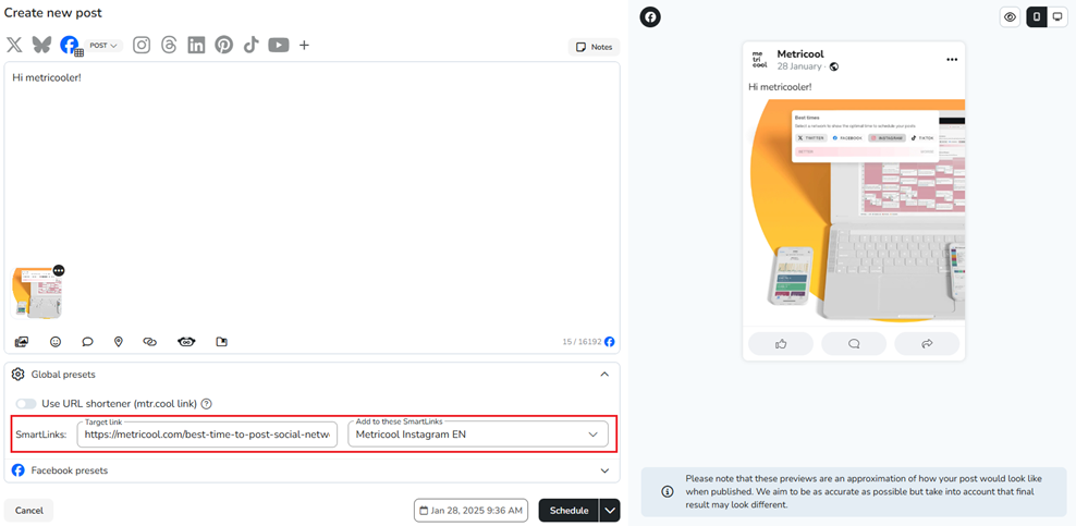 When creating a new post from the Planner, you can add it to one or multiple SmartLinks from the SmartLinks section within the post’s global settings.