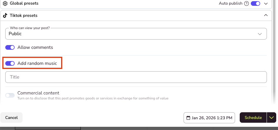 Yes. To publish automatically to TikTok and add music from Metricool, the Auto-publish option must be enabled in the planner.