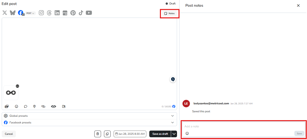 Optimize your workflow by adding notes in the Planner to provide context to your posts with reminders about links or images before publishing and to improve team collaboration by sharing ideas and receiving feedback directly on each post.