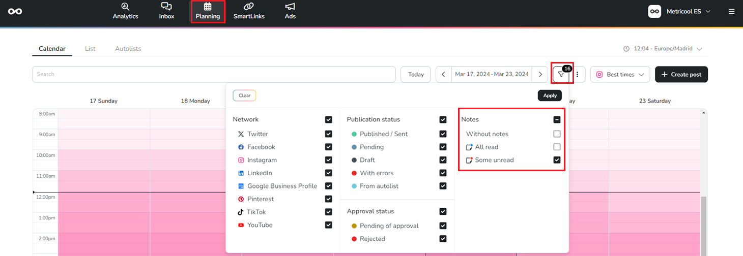 To check if another team member has left a note comment, select the "unread notes" filter: this way, posts with notes from other users will appear in the planner.