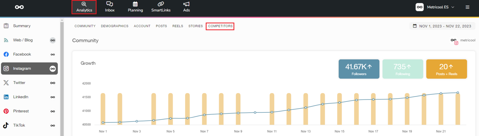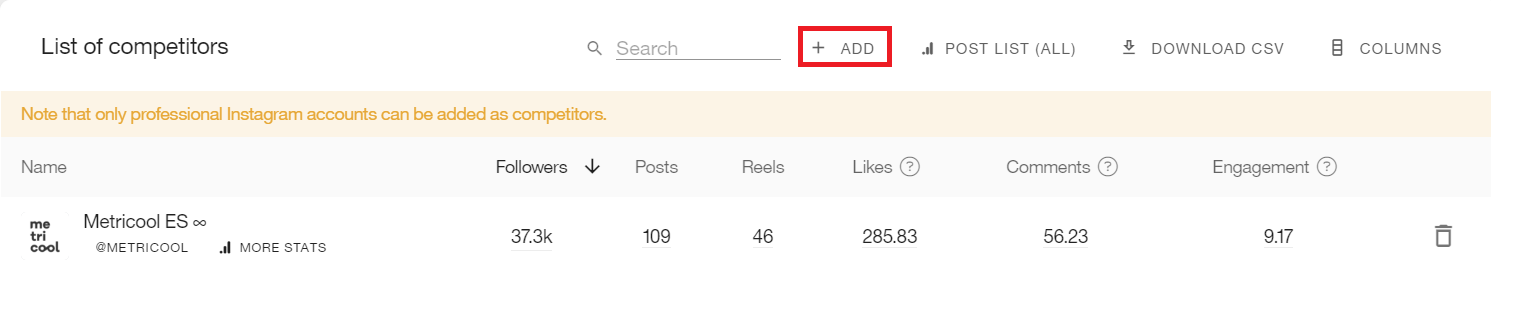 💡 Add your own account as a competitor. This way, you can compare your metrics with other profiles. Remember that the Competitors feature displays public data from each account, whereas connecting your profile with permissions gives you access to more detailed metrics.