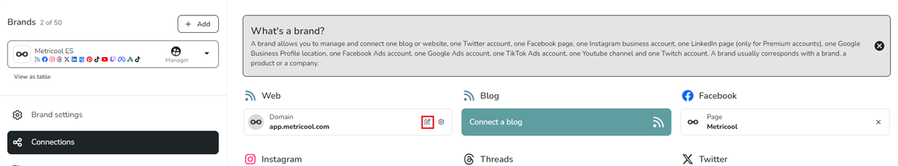 Once the connection is complete, you can edit the website domain by clicking the pencil icon. Keep in mind that editing only changes the displayed name but will not modify the website associated with the installed tracker. Refer to the section Change the connected website if you need to modify it.