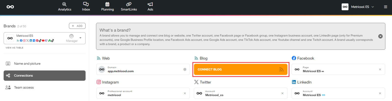 When you connect the website, if the blog has an RSS Feed configured, Metricool will automatically detect it and a new box will appear with the blog connection and the feed URL underneath.