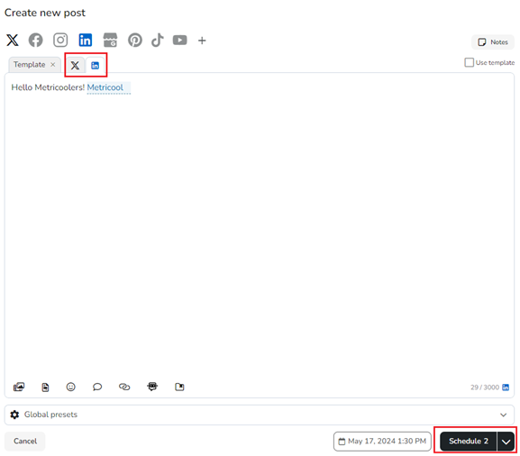 Through a template, you edit separately the post in each of the social networks where you want to publish. You can check the formats and options available in each social network here.