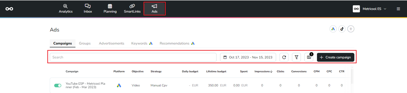 Create Campaign: You can create new campaigns from Metricool. Check the step-by-step guide here.