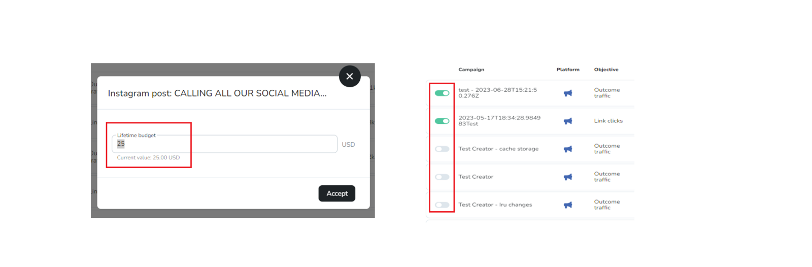 Additionally, you can update the daily and lifetime budget per campaign or ad groups by clicking on the amount, as well as enable/disable campaigns, ad groups, and/or ads.