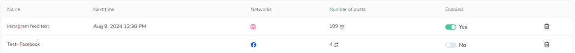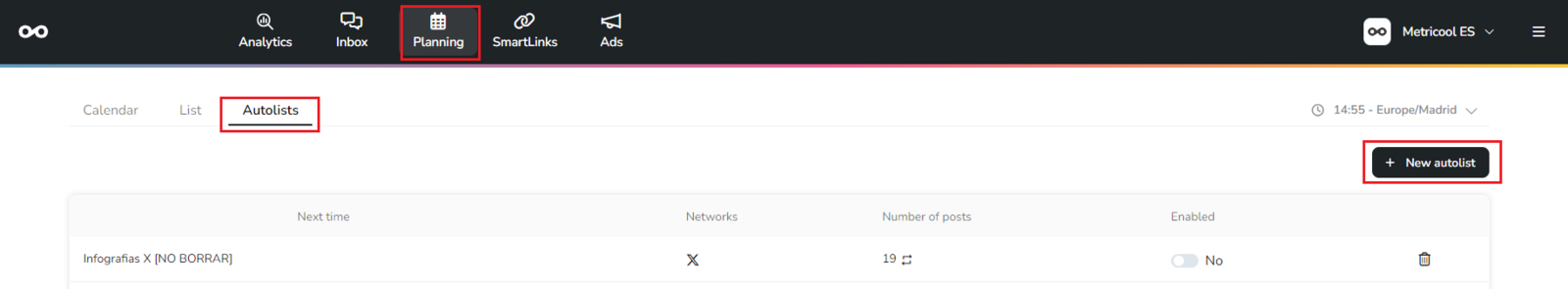 The overview shows the date of the next post, the active networks, the pending posts, and if the repetition is activated. From here, you can activate or deactivate each autolist and delete them by clicking the trash icon.