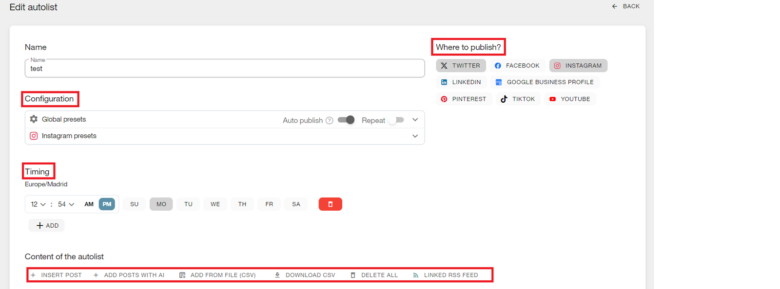 Program the day and time for posting the content. Autolist have a weekly frequency, add as many rows as you need.