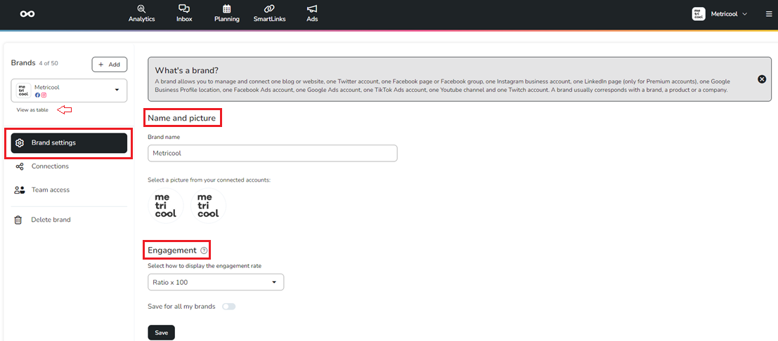 Edit your brand name and change the picture by selecting one of the logos extracted from the connected social networks, so you must first connect your social networks to have the images available.