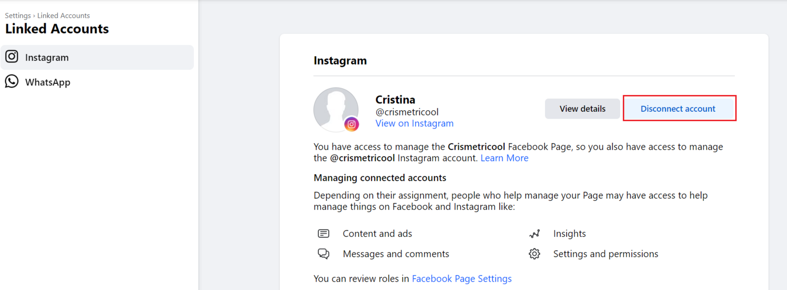 If you can't access the Linked Accounts page of your Page (Settings > Instagram in Classic Pages), it's possible that you lack the necessary role or access to your Facebook Page.