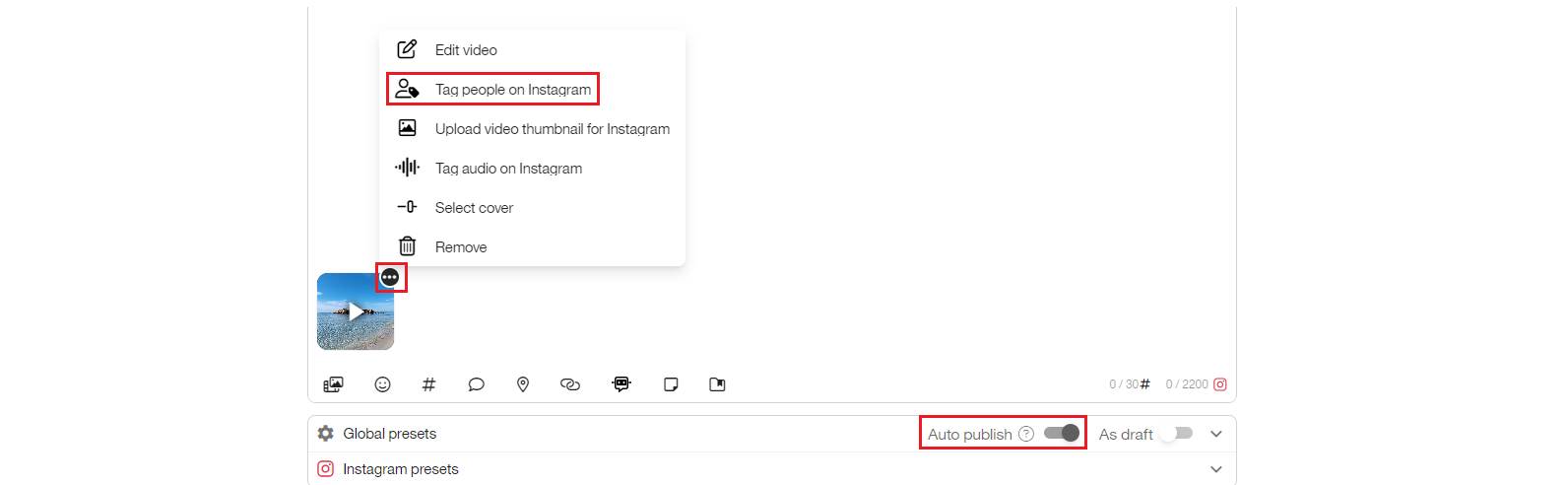On Instagram, tagging in images is available for posts and reels (not supported for video carousels or stories) and requires the auto-publish button to be enabled: