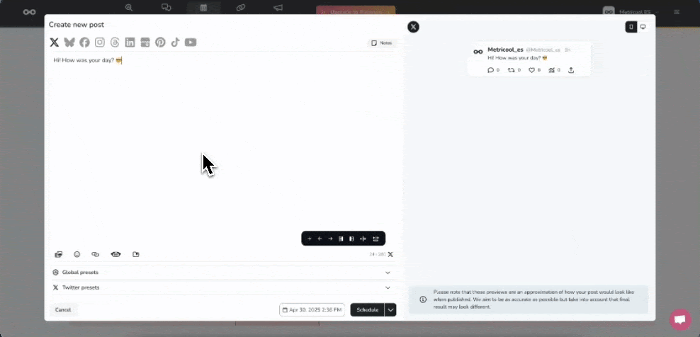 2. Add your text. You can create threads (up to 80 posts) and mention other accounts (like @metricool).