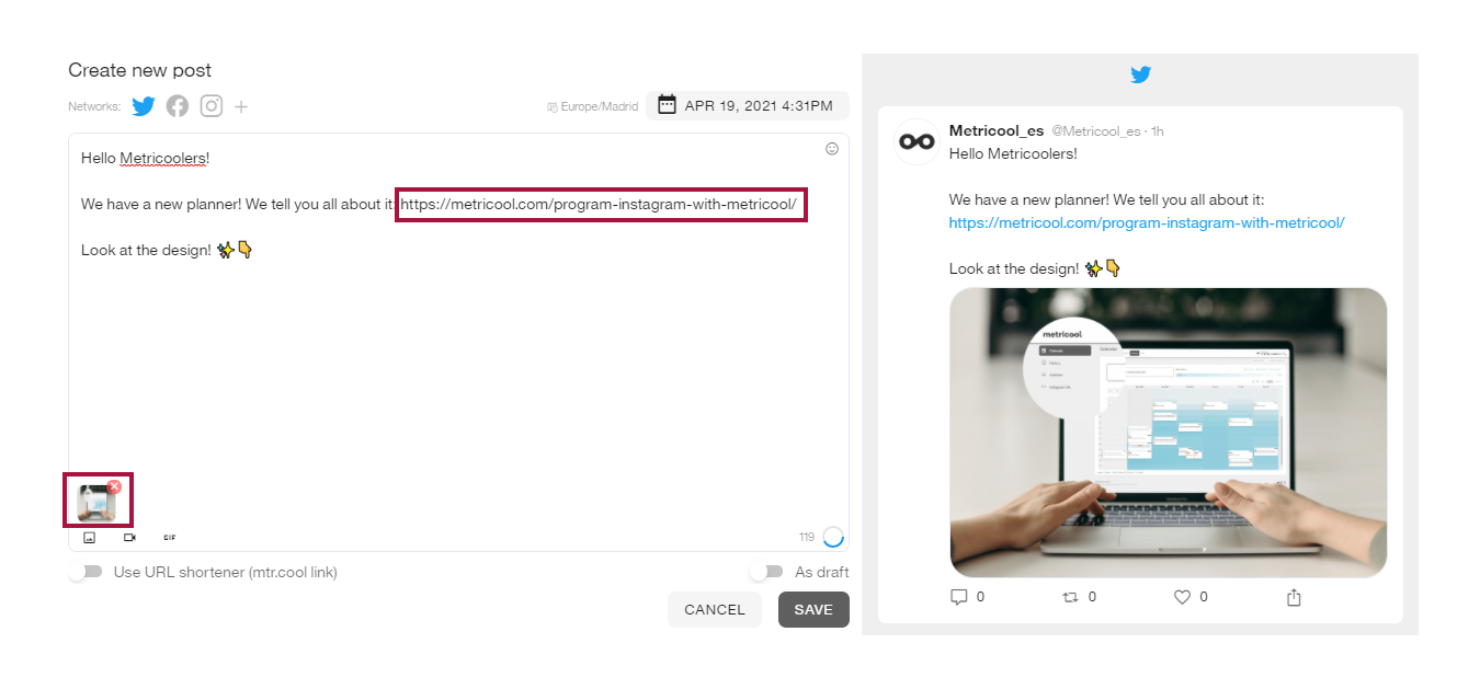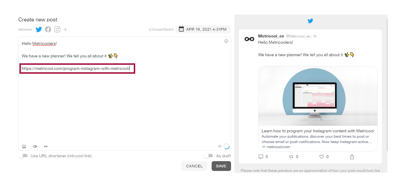 • For the link to be previewed, you simply have to add it in the text without attaching any image or video. The post will be published with the image extracted from the preview of the link. If you add two links, the last one will be previewed.