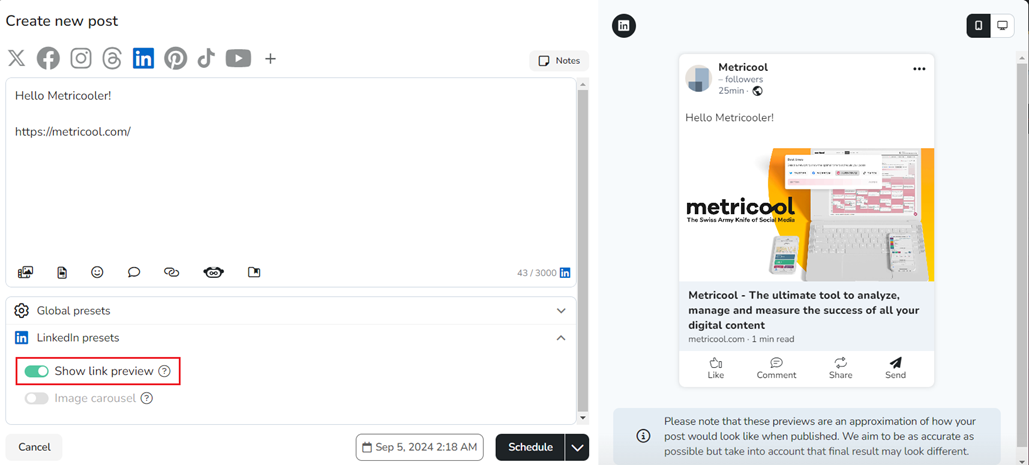 Exceptionally, in the LinkedIn settings, you have the option to enable link preview (if you add more than one link, the last one will be previewed).
