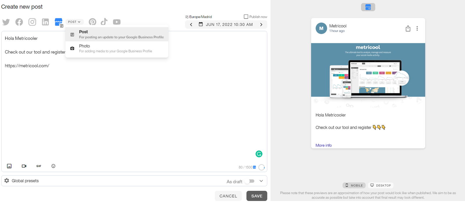 There are two types of content that can be scheduled in Google Business Profile (formerly Google my Business) from Metricool: