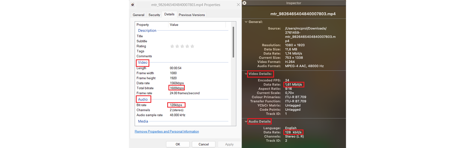 Windows: Right-click on the file, select Properties, and review the bitrate information in the details tab.