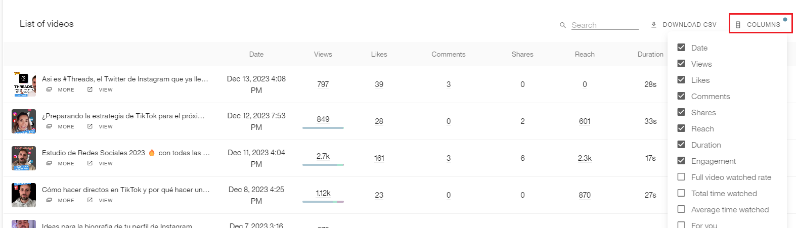 • Missing data due to video inactivity: If certain metrics such as reach or total watch time don’t display data, it’s likely that the video has been inactive for more than 7 days (no views, comments, likes, or shares). To recover data, interact with the video and wait 24–48 hours for the information to update.