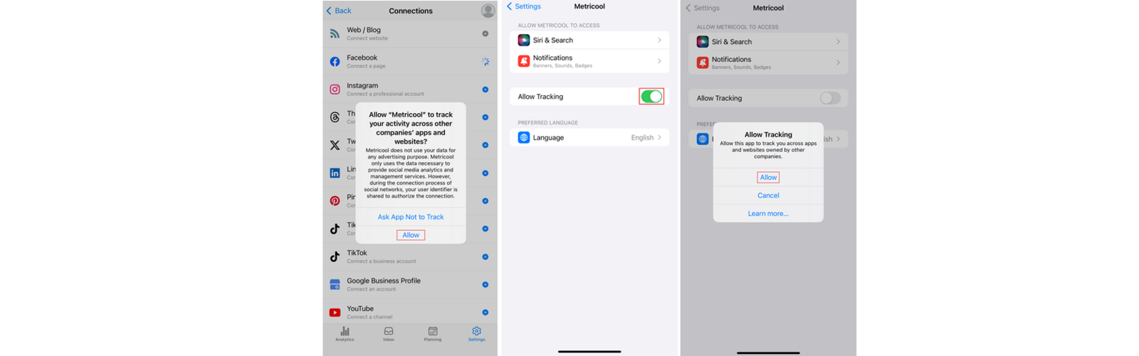 During the first connection in the Metricool app, you must click allow. If you previously denied tracking, you can change the settings in iOS settings > Metricool > Allow Tracking.