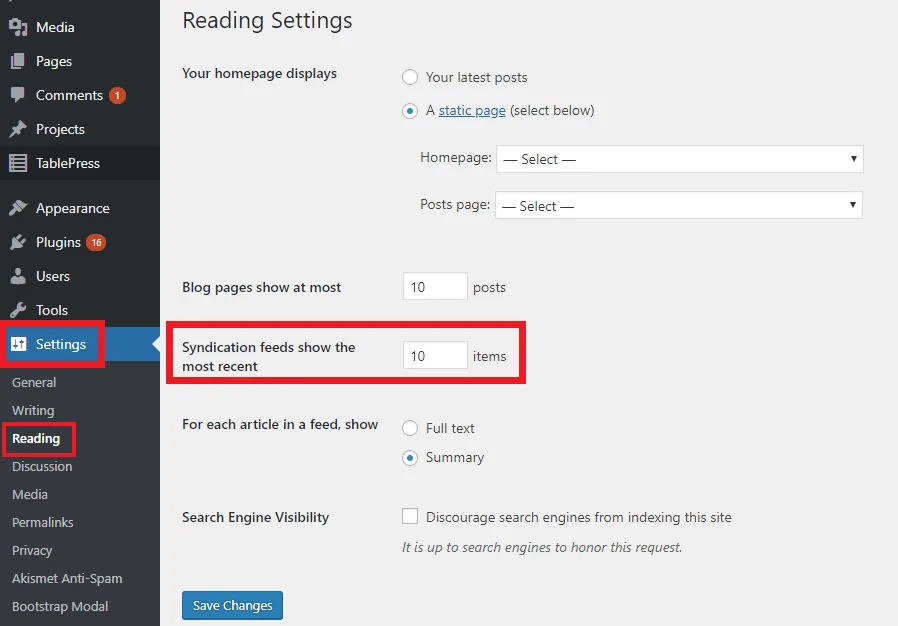 3. In the "Syndication feeds show the most recent" field, define how many posts you want to appear in the RSS.